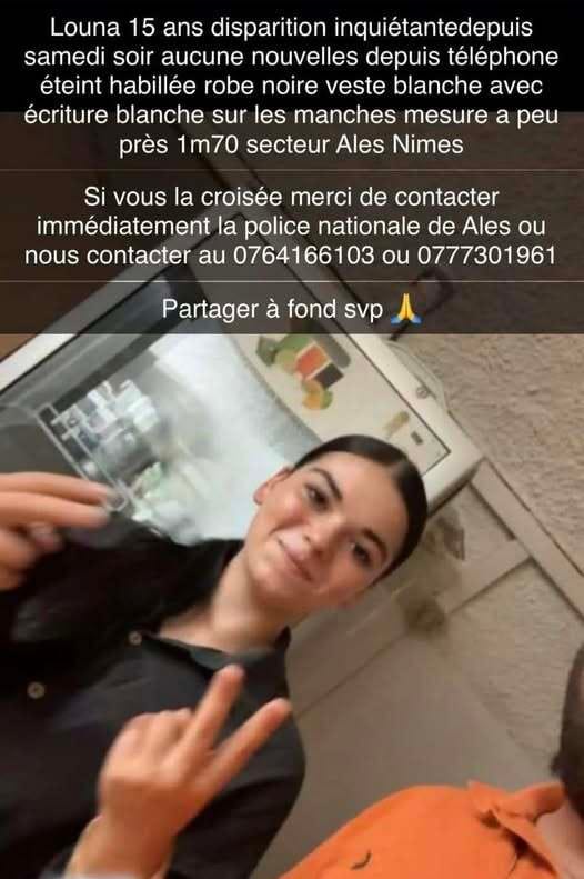 Triste nouvelle en ouverture : un appel à témoins a été lancé pour Louna, 15 ans, disparue samedi soir dans le Gard (secteur Nîmes–Alès). Elle portait une robe noire et une veste blanche avec inscription sur les manches.